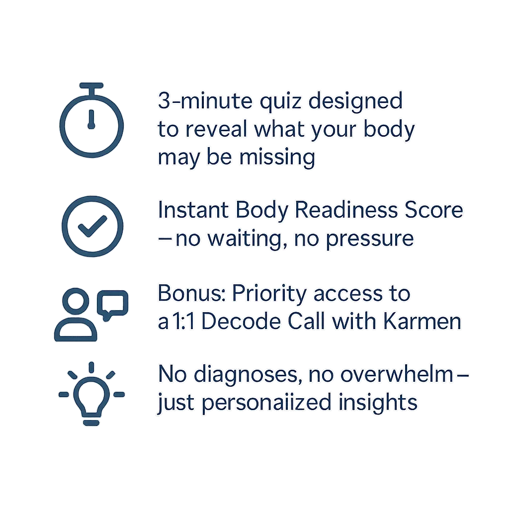Karmen isn’t here to hand out protocols. She’s here to help you finally understand what your body is trying to say especially when nothing else has worked.